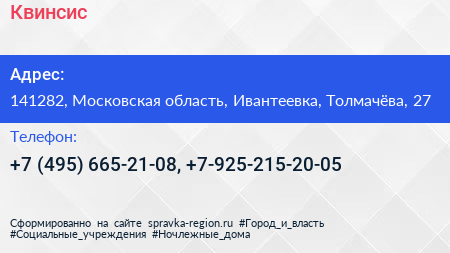 Квинсис по адресу 141282, Московская область, Ивантеевка, Толмачёва, 27 в дальнейшем Организация, размещена в следующих категориях: