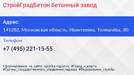 СтройГрадБетон, бетонный завод по адресу 141282, Московская область, Ивантеевка, Толмачёва, 80 в дальнейшем Организация, размещена в следующих категориях: