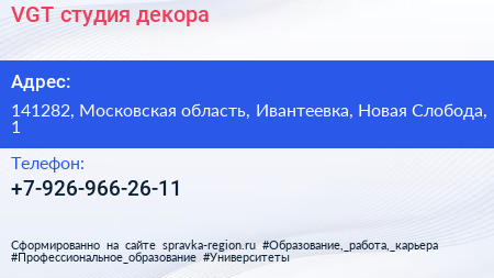 VGT, студия декора по адресу 141282, Московская область, Ивантеевка, Новая Слобода, 1 в дальнейшем Организация, размещена в следующих категориях: