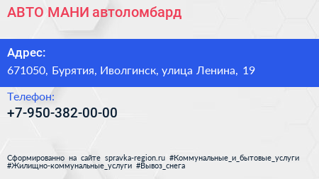 АВТО МАНИ, автоломбард по адресу 671050, Бурятия, Иволгинск, улица Ленина, 19 в дальнейшем Организация, размещена в следующих категориях: