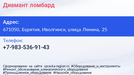 Диамант, ломбард по адресу 671050, Бурятия, Иволгинск, улица Ленина, 25 в дальнейшем Организация, размещена в следующих категориях: