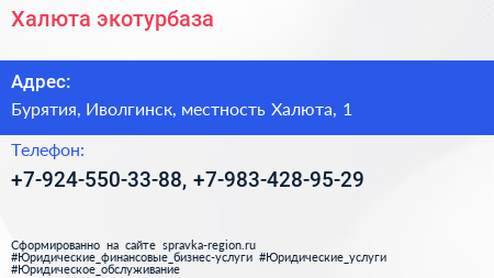 Халюта, экотурбаза по адресу Бурятия, Иволгинск, местность Халюта, 1 в дальнейшем Организация, размещена в следующих категориях: