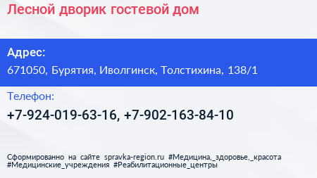 Лесной дворик, гостевой дом по адресу 671050, Бурятия, Иволгинск, Толстихина, 138/1 в дальнейшем Организация, размещена в следующих категориях: