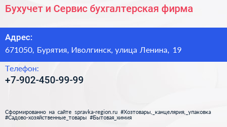 Бухучет и Сервис, бухгалтерская фирма по адресу 671050, Бурятия, Иволгинск, улица Ленина, 19 в дальнейшем Организация, размещена в следующих категориях: