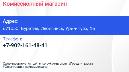 Комиссионный магазин по адресу 671050, Бурятия, Иволгинск, Урин-Туяа, 1Б в дальнейшем Организация, размещена в следующих категориях: