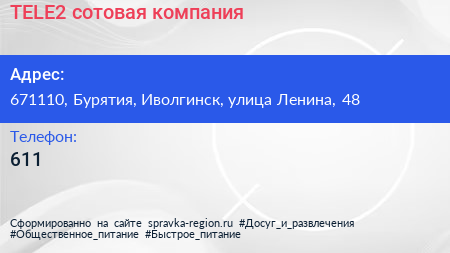 TELE2, сотовая компания по адресу 671110, Бурятия, Иволгинск, улица Ленина, 48 в дальнейшем Организация, размещена в следующих категориях: