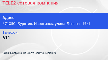 TELE2, сотовая компания по адресу 671050, Бурятия, Иволгинск, улица Ленина, 19/1 в дальнейшем Организация, размещена в следующих категориях: