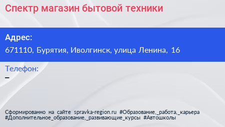 Спектр, магазин бытовой техники по адресу 671110, Бурятия, Иволгинск, улица Ленина, 16 в дальнейшем Организация, размещена в следующих категориях: