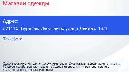 Магазин одежды по адресу 671110, Бурятия, Иволгинск, улица Ленина, 18/1 в дальнейшем Организация, размещена в следующих категориях: