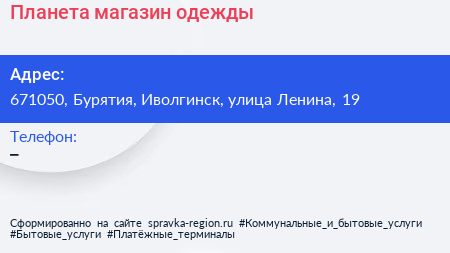 Планета, магазин одежды по адресу 671050, Бурятия, Иволгинск, улица Ленина, 19 в дальнейшем Организация, размещена в следующих категориях:
