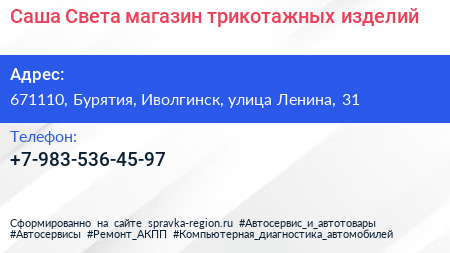 Саша+Света, магазин трикотажных изделий по адресу 671110, Бурятия, Иволгинск, улица Ленина, 31 в дальнейшем Организация, размещена в следующих категориях: