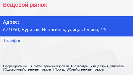 Вещевой рынок по адресу 671050, Бурятия, Иволгинск, улица Ленина, 25 в дальнейшем Организация, размещена в следующих категориях: