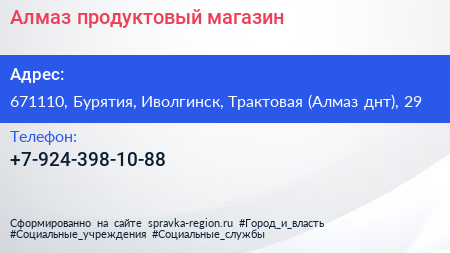 Алмаз, продуктовый магазин по адресу 671110, Бурятия, Иволгинск, Трактовая (Алмаз днт), 29 в дальнейшем Организация, размещена в следующих категориях: