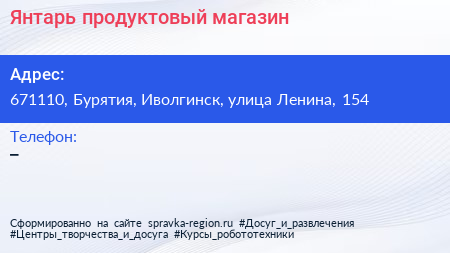 Янтарь, продуктовый магазин по адресу 671110, Бурятия, Иволгинск, улица Ленина, 154 в дальнейшем Организация, размещена в следующих категориях: