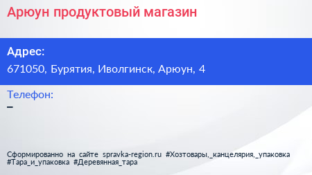 Арюун, продуктовый магазин по адресу 671050, Бурятия, Иволгинск, Арюун, 4 в дальнейшем Организация, размещена в следующих категориях: