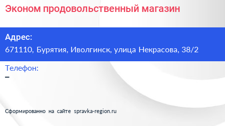 Эконом, продовольственный магазин по адресу 671110, Бурятия, Иволгинск, улица Некрасова, 38/2 в дальнейшем Организация, размещена в следующих категориях: