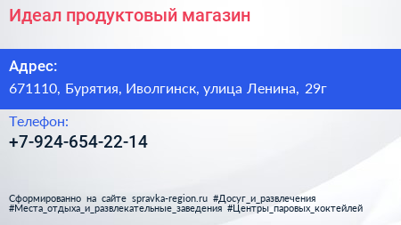 Идеал, продуктовый магазин по адресу 671110, Бурятия, Иволгинск, улица Ленина, 29г в дальнейшем Организация, размещена в следующих категориях: