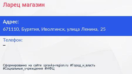 Ларец, магазин по адресу 671110, Бурятия, Иволгинск, улица Ленина, 25 в дальнейшем Организация, размещена в следующих категориях: