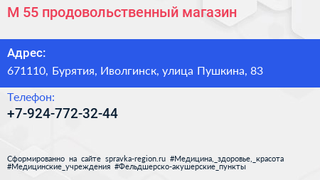 М-55, продовольственный магазин по адресу 671110, Бурятия, Иволгинск, улица Пушкина, 83 в дальнейшем Организация, размещена в следующих категориях: