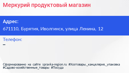 Меркурий, продуктовый магазин по адресу 671110, Бурятия, Иволгинск, улица Ленина, 12 в дальнейшем Организация, размещена в следующих категориях: