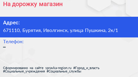 На дорожку, магазин по адресу 671110, Бурятия, Иволгинск, улица Пушкина, 2к/1 в дальнейшем Организация, размещена в следующих категориях: