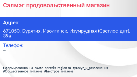 Сэлмэг, продовольственный магазин по адресу 671050, Бурятия, Иволгинск, Изумрудная (Светлое днт), 39а в дальнейшем Организация, размещена в следующих категориях: