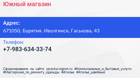 Южный, магазин по адресу 671050, Бурятия, Иволгинск, Гаськова, 43 в дальнейшем Организация, размещена в следующих категориях:
