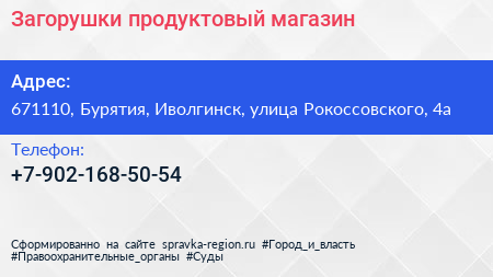 Загорушки, продуктовый магазин по адресу 671110, Бурятия, Иволгинск, улица Рокоссовского, 4а в дальнейшем Организация, размещена в следующих категориях: