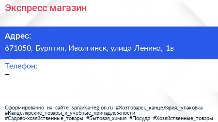 Экспресс, магазин по адресу 671050, Бурятия, Иволгинск, улица Ленина, 1в в дальнейшем Организация, размещена в следующих категориях: