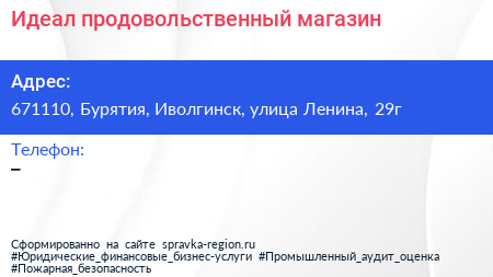 Идеал, продовольственный магазин по адресу 671110, Бурятия, Иволгинск, улица Ленина, 29г в дальнейшем Организация, размещена в следующих категориях: