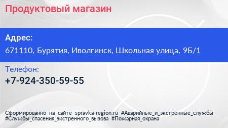 Продуктовый магазин по адресу 671110, Бурятия, Иволгинск, Школьная улица, 9Б/1 в дальнейшем Организация, размещена в следующих категориях: