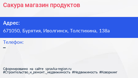 Сакура, магазин продуктов по адресу 671050, Бурятия, Иволгинск, Толстихина, 138а в дальнейшем Организация, размещена в следующих категориях: