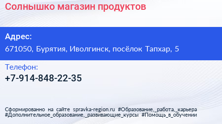 Солнышко, магазин продуктов по адресу 671050, Бурятия, Иволгинск, посёлок Тапхар, 5 в дальнейшем Организация, размещена в следующих категориях: