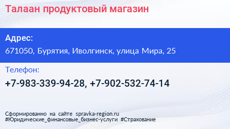 Талаан, продуктовый магазин по адресу 671050, Бурятия, Иволгинск, улица Мира, 25 в дальнейшем Организация, размещена в следующих категориях: