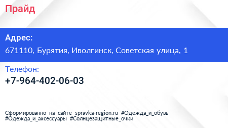 Прайд по адресу 671110, Бурятия, Иволгинск, Советская улица, 1 в дальнейшем Организация, размещена в следующих категориях: