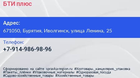 БТИ плюс по адресу 671050, Бурятия, Иволгинск, улица Ленина, 25 в дальнейшем Организация, размещена в следующих категориях: