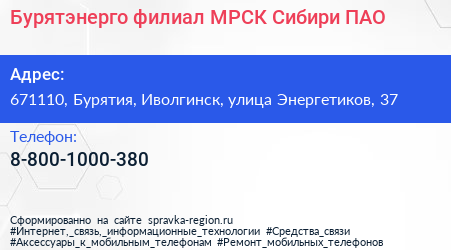 Бурятэнерго, филиал МРСК Сибири, ПАО по адресу 671110, Бурятия, Иволгинск, улица Энергетиков, 37 в дальнейшем Организация, размещена в следующих категориях: