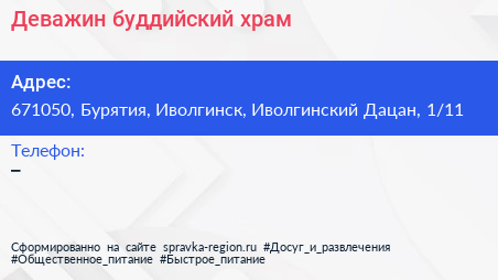 Деважин, буддийский храм по адресу 671050, Бурятия, Иволгинск, Иволгинский Дацан, 1/11 в дальнейшем Организация, размещена в следующих категориях: