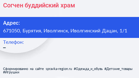 Согчен, буддийский храм по адресу 671050, Бурятия, Иволгинск, Иволгинский Дацан, 1/1 в дальнейшем Организация, размещена в следующих категориях: