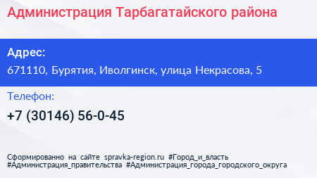 Администрация Тарбагатайского района по адресу 671110, Бурятия, Иволгинск, улица Некрасова, 5 в дальнейшем Организация, размещена в следующих категориях: