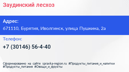 Заудинский лесхоз по адресу 671110, Бурятия, Иволгинск, улица Пушкина, 2а в дальнейшем Организация, размещена в следующих категориях: