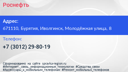 Роснефть по адресу 671110, Бурятия, Иволгинск, Молодёжная улица, 8 в дальнейшем Организация, размещена в следующих категориях: