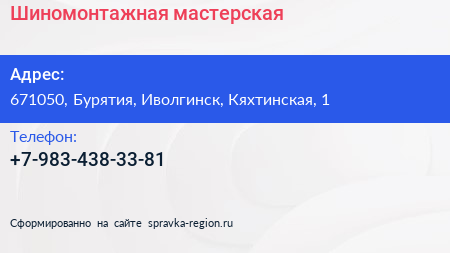 Шиномонтажная мастерская по адресу 671050, Бурятия, Иволгинск, Кяхтинская, 1 в дальнейшем Организация, размещена в следующих категориях: