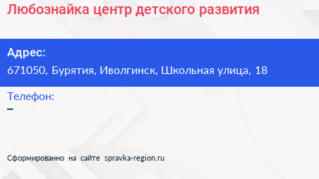 Любознайка, центр детского развития по адресу 671050, Бурятия, Иволгинск, Школьная улица, 18 в дальнейшем Организация, размещена в следующих категориях: