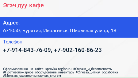 Эгэч дуу, кафе по адресу 671050, Бурятия, Иволгинск, Школьная улица, 18 в дальнейшем Организация, размещена в следующих категориях:
