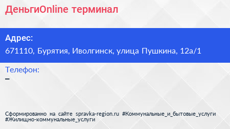 ДеньгиOnline, терминал по адресу 671110, Бурятия, Иволгинск, улица Пушкина, 12а/1 в дальнейшем Организация, размещена в следующих категориях: