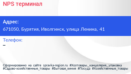NPS, терминал по адресу 671050, Бурятия, Иволгинск, улица Ленина, 41 в дальнейшем Организация, размещена в следующих категориях:
