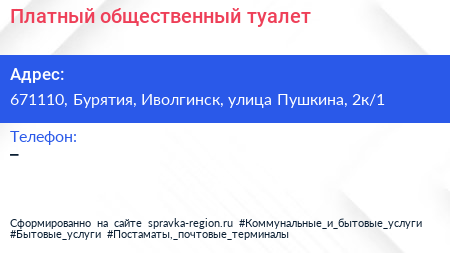 Платный общественный туалет по адресу 671110, Бурятия, Иволгинск, улица Пушкина, 2к/1 в дальнейшем Организация, размещена в следующих категориях: