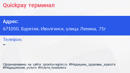 Quickpay, терминал по адресу 671050, Бурятия, Иволгинск, улица Ленина, 71г в дальнейшем Организация, размещена в следующих категориях: