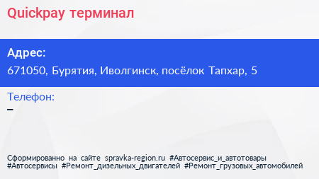 Quickpay, терминал по адресу 671050, Бурятия, Иволгинск, посёлок Тапхар, 5 в дальнейшем Организация, размещена в следующих категориях: